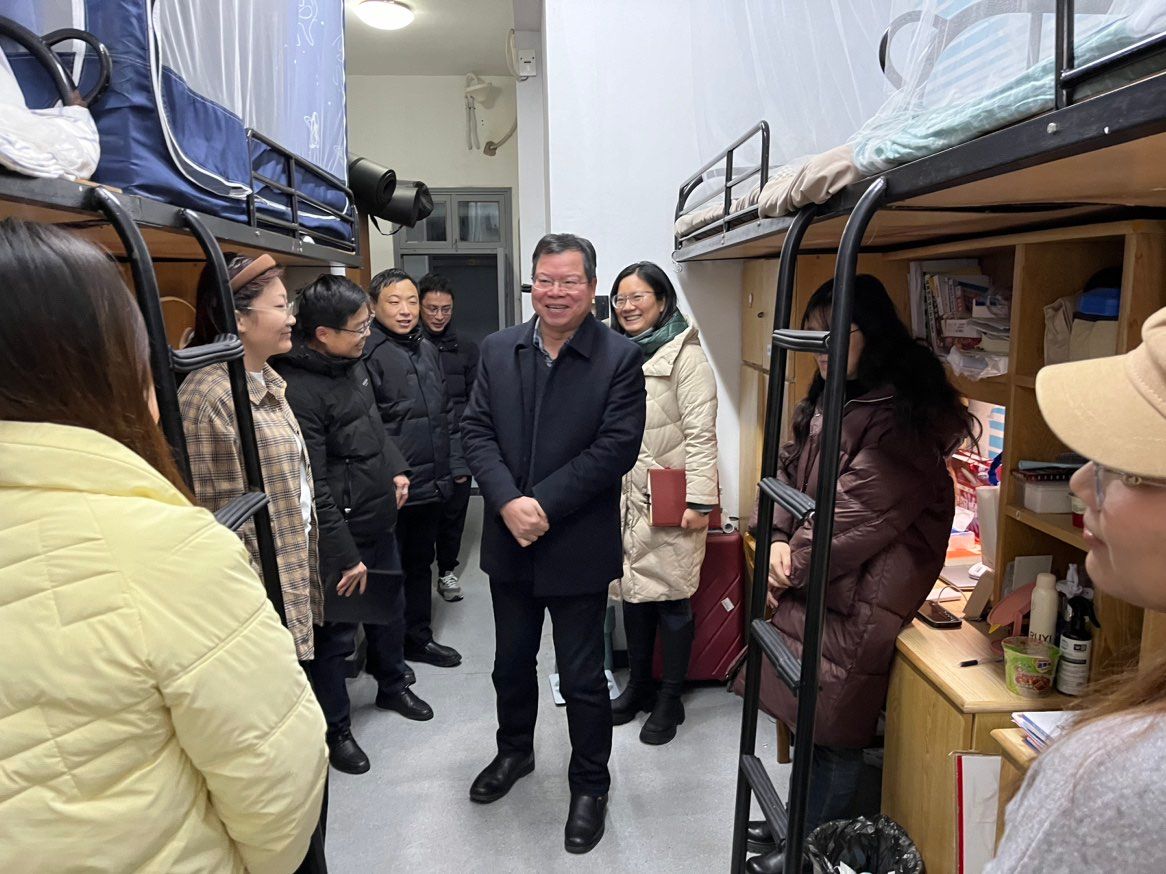 在本科学生宿舍,吴书记向同学们表达了学校的关心和问候,详细询问他们寒假期间的学习生活情况和开学报到情况,耐心询问大家目前就业工作进展、考研准备情况以及在生活上、工作上是否存在困难等,并给予相应的指导和建议。他亲切叮嘱同学们在新学期要及时调整状态,做好新学期的学习规划,建立和谐友好的人际关系,以积极的心态和良好的面貌迎接新学期的校园生活。