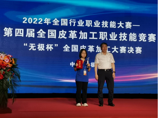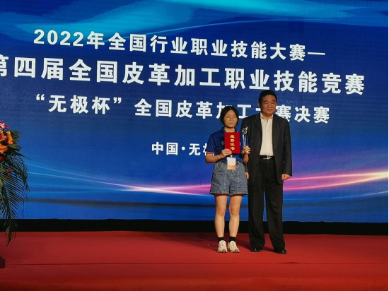 决赛内容由理论考试(占30%)和实操考试(占70%)两部分组成,理论考试内容包括职业道德、专业基础知识和皮革加工专业知识,实操考试则为提供样品的涂饰操作,时长120分钟。经过紧张激烈的竞赛、裁判组的严谨评审和科学的信息数字化管理系统的统计,我院轻化工程系于丽丹同学、陈欣怡同学、顾林锋同学分别夺得了本次大赛总决赛学生组的第一名、第二名和第三名,何叶青同学、余泽新同学分别获得了第五名和第八名,我校被授予优秀组织奖。中国轻工业联合会副会长、中国皮革协会理事长李玉中、无极县县委书记封立新、中国财贸轻纺烟草工会轻工烟草工作部部长杨栋国、中国皮革协会副理事长陈占光等领导为获奖选手颁奖。