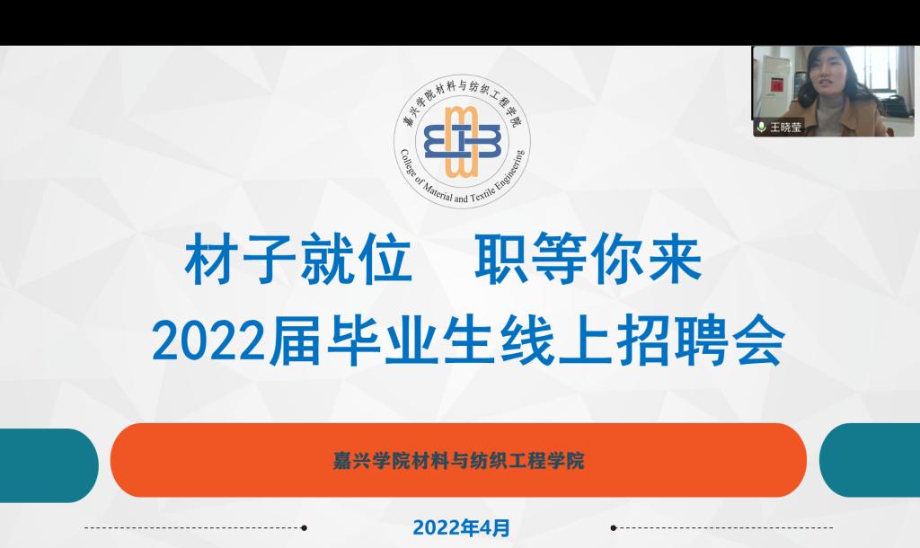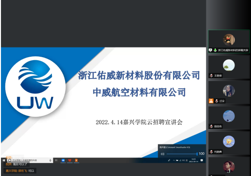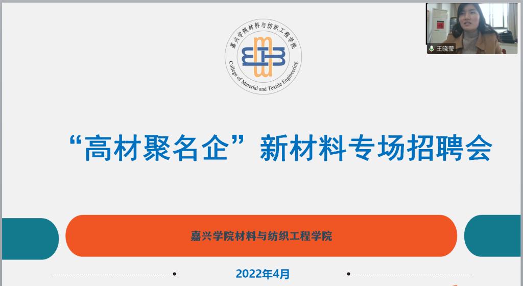 4月14日下午,“高材聚名企”新材料类首次专场招聘会在线上如期举行。中国巨石股份有限公司、浙江佑威新材料股份有限公司、万凯新材料股份有限公司、嘉兴普利特股份有限公司、浙江博菲电器股份有限公司等五家企业提供50余个岗位,150余名学生在直播间与招聘单位就发展平台、薪资待遇等问题进行了精准互动,实现了线上面对面的充分交流。