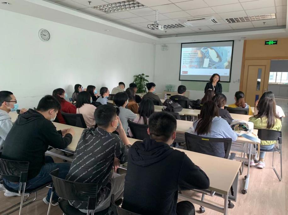 下图为同学们认真聆听企业导师鲍博士围绕世界服装贸易及标准体系展开的纺织品检验检测理论的介绍。