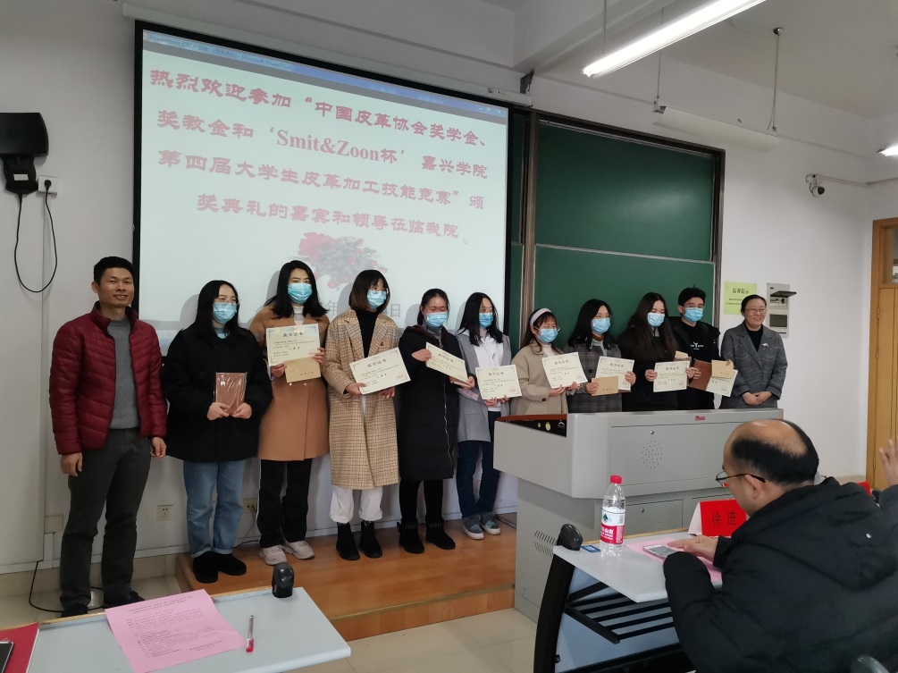 1月14日,我院在14号楼316教室隆重举行 “中国皮革协会奖学金、奖教金”和“‘Smit & Zoon杯’嘉兴学院第四届大学生皮革加工技能竞赛”颁奖典礼。中国皮革协会副理事长、浙江省皮革行业协会理事长李伟娟女士、浙江省皮革行业协会秘书长官敏健女士、浙江省皮革行业协会常务副秘书长谢基尔先生、荷兰Smit & Zoon公司涂饰部中国区总经理徐建平先生、社会合作处副处长徐进、我院党委书记、院长易洪雷教授、副院长李海东教授、轻化工程系主任罗建勋副教授及轻化工程系全体教师和获奖学生代表参加了本次颁奖典礼,典礼由学院副书记黄芳芳老师主持。