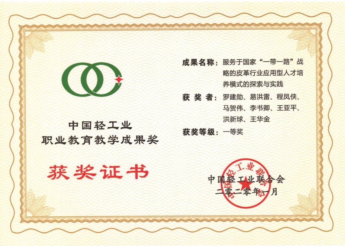 我院罗建勋、易洪雷、程凤侠等老师申报的题为“服务于国家‘一带一路’战略的皮革行业应用型人才培养模式的探索与实践”的教学成果获2019年第二届中国轻工业职业教育教学成果一等奖。该成果和奖项是对我院轻化工程专业多年来专业建设和教学改革探索和实践的总结与成效的认可。