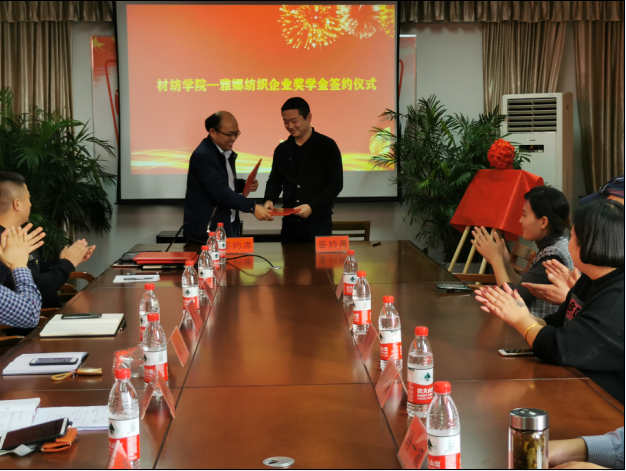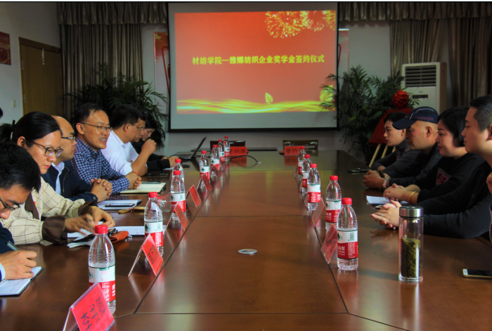 副院长黄立新代表学院致欢迎辞。他高度评价了两家单位对于双方合作的重视,并希望以此次签约为契机,进一步加强校企双方在产学合作、人才培养、技术攻坚等方面的深度融合,形成“资源共享、优势互补、共同发展”的双赢局面。随后,两家公司代表讲话,他们介绍了公司的发展历程、群p和发展需求,特别感谢学院给予的智力和人才支持,希望学院能够多输送一些技术专家和优秀学生,助力企业发展。两家公司在这次产学合作中,为支持学校教育事业发展,还自愿向校教育发展基金会捐赠11万元人民币,用于支持纺织和轻化专业建设发展。最后,与会教师与企业代表进行深入交谈,为下一步深入合作奠定良好基础。