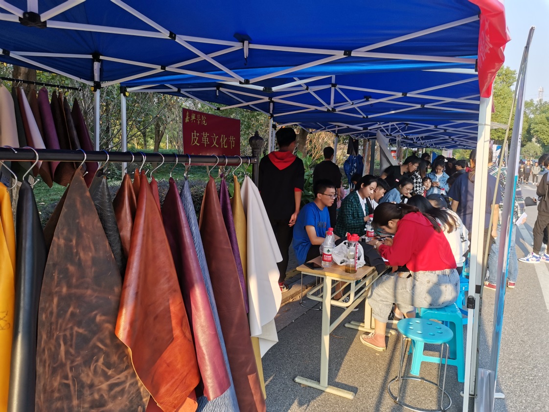 在喜迎我校办学105周年之际,作为校庆重要活动内容之一,由我院轻化工程系主办与院团委协办的“嘉兴学院第四届皮革文化节”于10月19日在梁林校区第一食堂对面举行。本届皮革文化节由李书卿老师和轻化(实验)171班王荣娅同学联袂策划,轻化工程系全体师生、学院团委干事及梁林校区其它专业的学生参与了该项活动。另外,我院院长易洪雷教授莅临皮革文化节现场并给予指导。