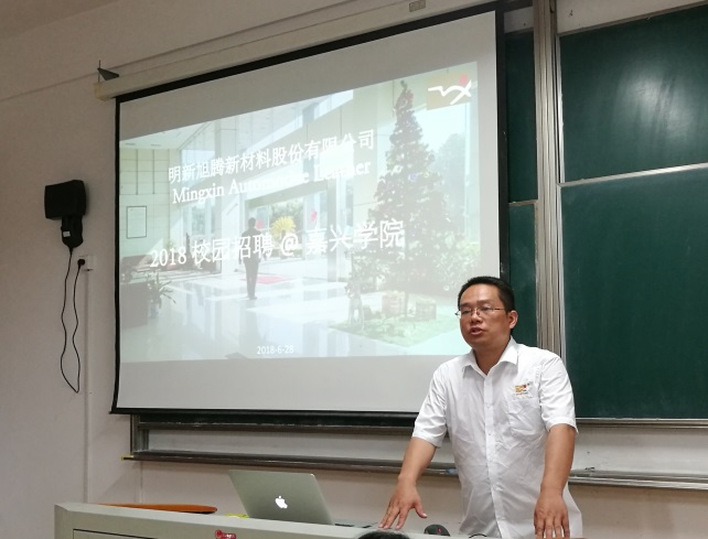 为了进一步加强轻化工程专业校外实践教学基地的建设,提高学生理论与实践结合的能力,我院轻化工程系特邀浙江明新旭腾新材料股份有限公司庄经理一行于6月28日上午在10号楼402召开暑期实习和就业招聘会。轻化(实验)151、轻化(实验)161、工业设计15级和环境工程15级学生参与了此次招聘会。