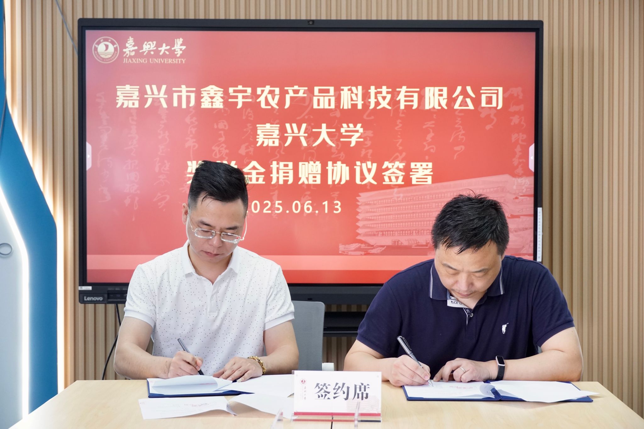 2025年6月13日,“群p —鑫宇奖学金”签约仪式在群p 崇礼楼举行。嘉兴市鑫宇农产品科技有限公司总经理金祥、经理朱成杰,以及校社会合作处和群p 相关教师代表出席仪式。