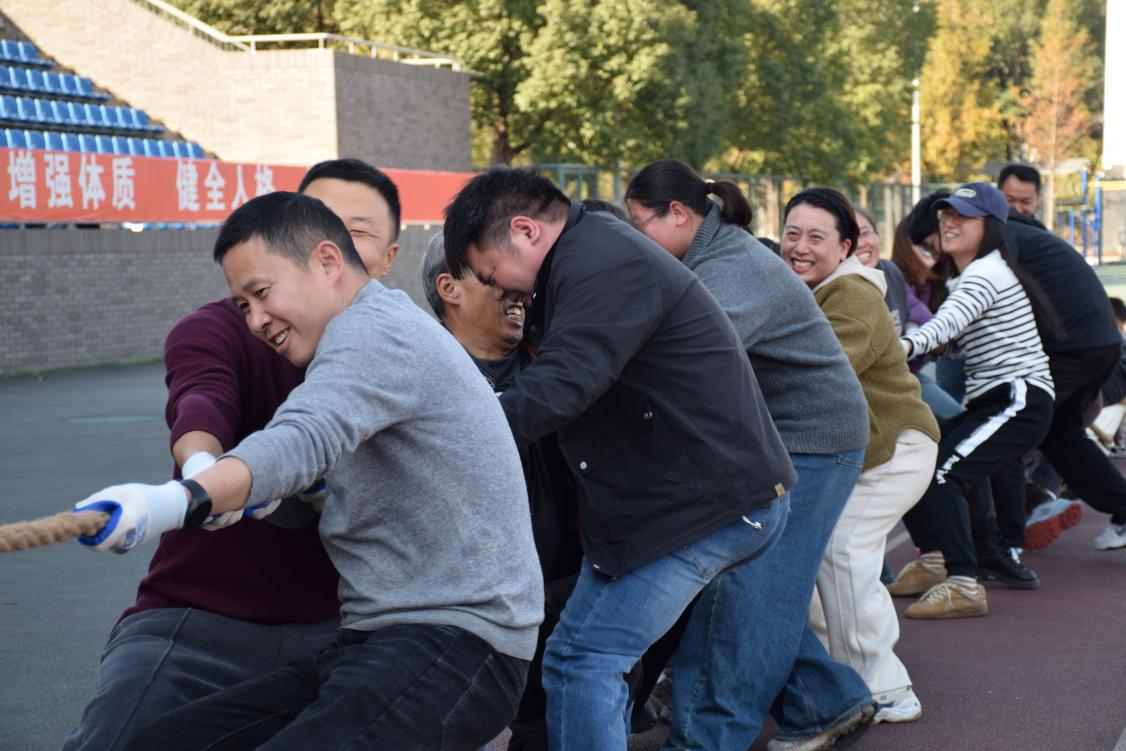 本次运动会共设置“飞黄腾达”、“一圈到底”、“舞动绳弦”、“毽步如飞”、“螃蟹赛跑”、“天地开花”、“力拔山河”及“座席争锋”八个集体项目。比赛中,师生并肩协作,全情投入。“飞黄腾达”考验专注与耐心,“一圈到底”和“舞动绳弦”展现团队默契,“螃蟹赛跑”和“天地开花”引发阵阵欢笑,现场气氛不断升温。压轴项目“力拔山河”与“座席争锋”更是将比赛推向高潮,师生在竞技中彰显斗志与凝聚力,场边加油声此起彼伏,震耳欲聋,瞬间点燃全场热情。