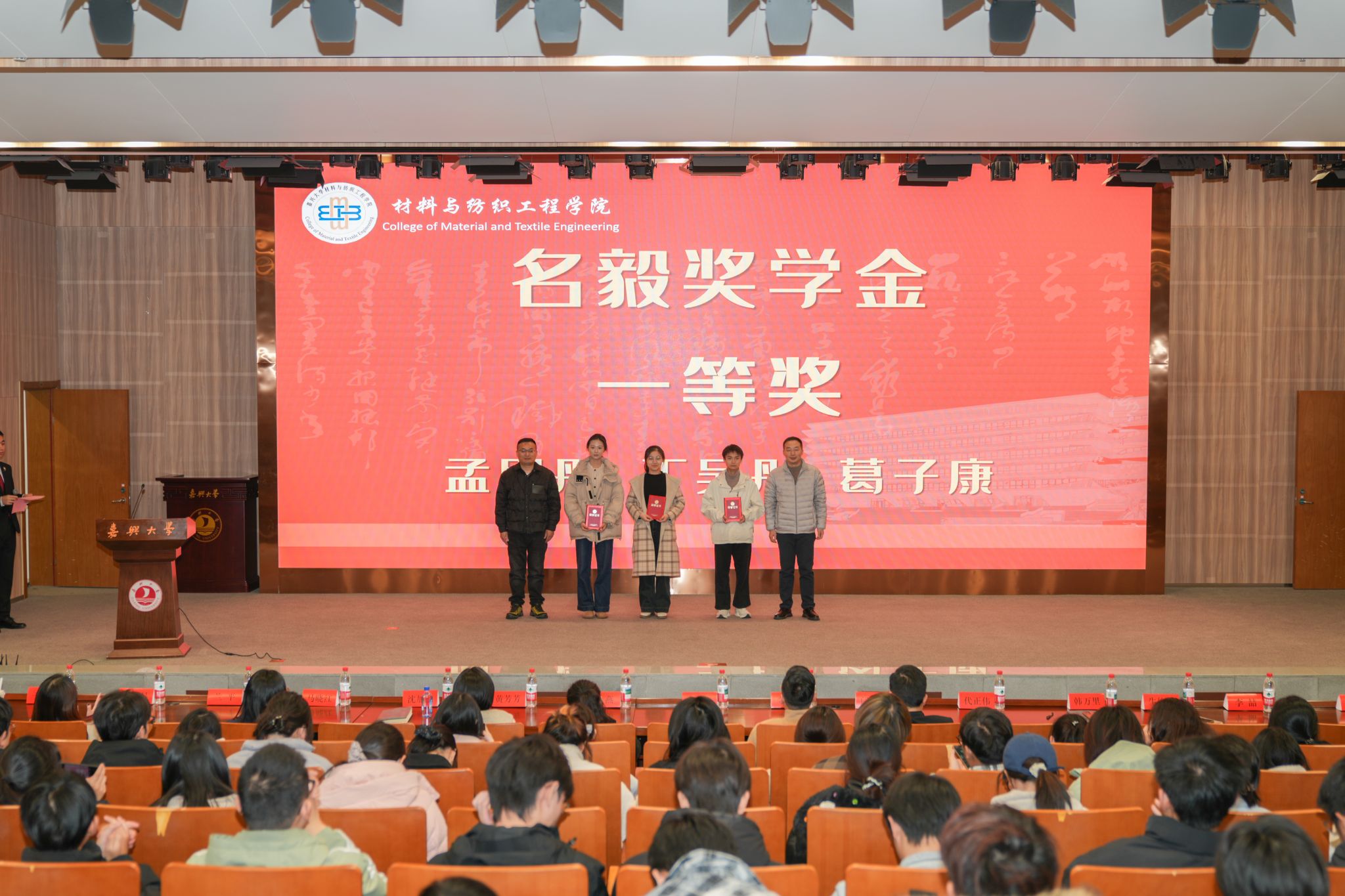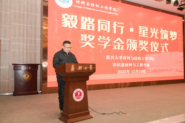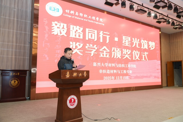 2025年12月15日,非织造材料与工程专业“名毅奖学金”和“鑫宇奖学金”颁奖典礼在图书馆报告厅隆重举行。本次典礼以“毅路同行,星光筑梦”为主题,表彰了60名品学兼优的在校学生。浙江名毅能源股份有限公司总经理徐井、副经理张燕、嘉兴市鑫宇农产品科技有限公司总经理金祥、学院党政班子及非织系专业教师代表、200余名非织学生共同见证了这一荣誉时刻。