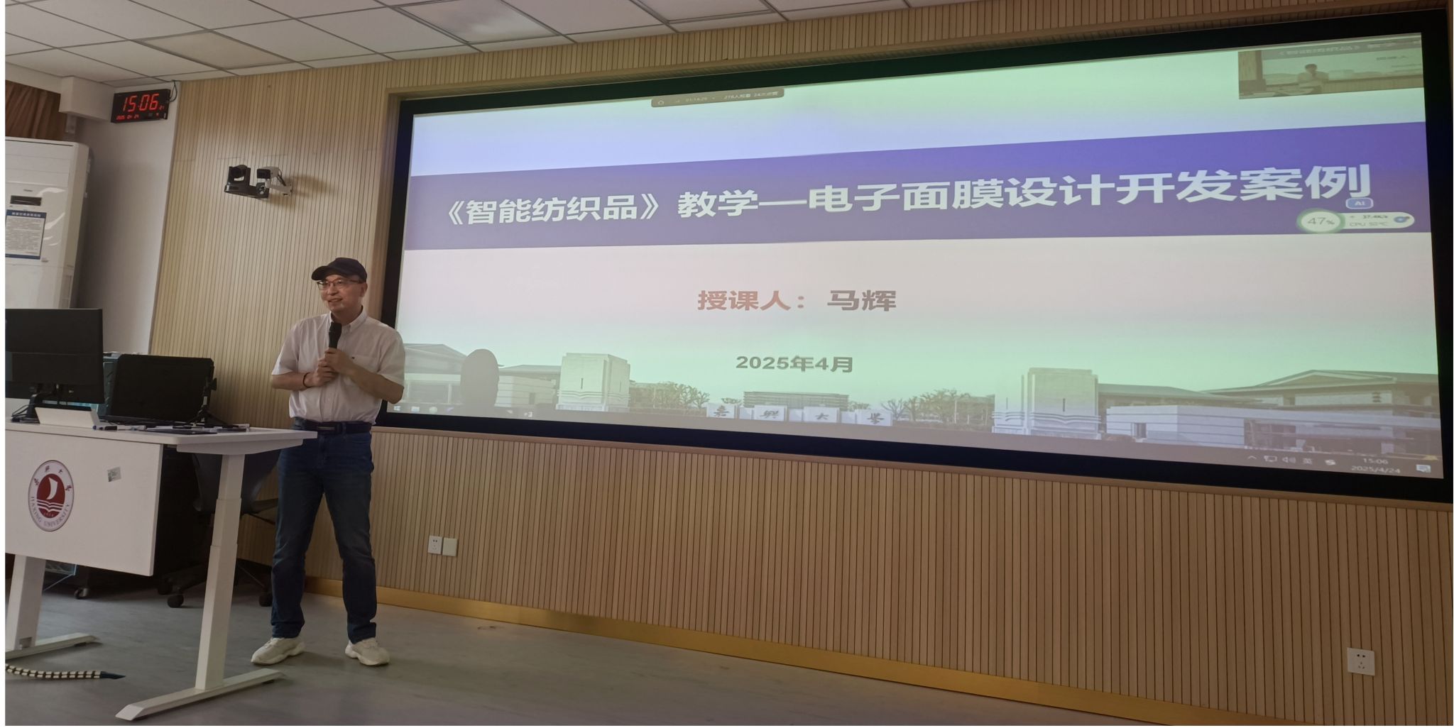 马辉教授以“《智能纺织品》教学—电子面膜设计开发案例”为题,详细介绍了电子面膜设计开发案例教学的实操全过程,从产品设计背景、研发、质检评价、销售、合作、成果展示等学生任务设置进行了详细说明。与会老师就案例教学法实施难度、学生参与度不均衡等问题进行深入交流。