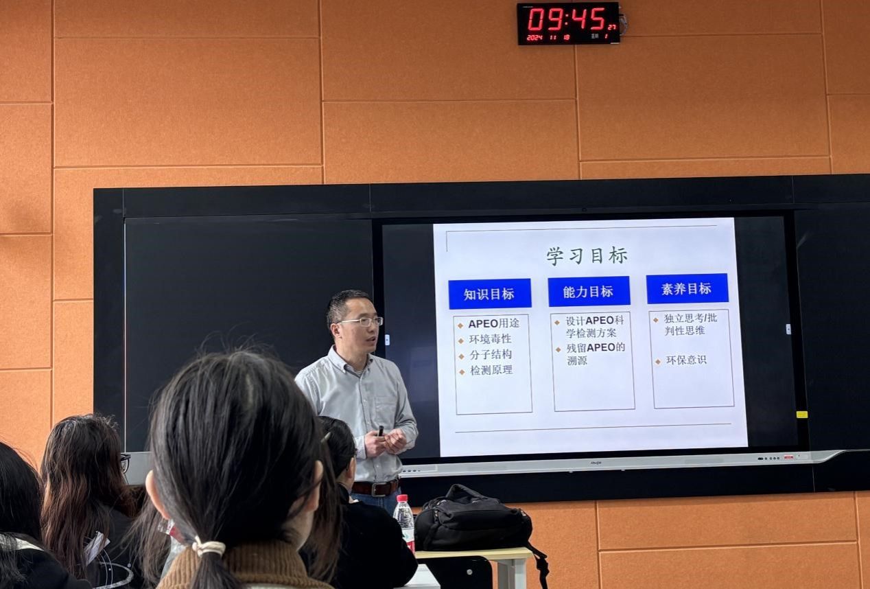 2024年11月18日上午,我院“一流课程系列公开示范课”本学期第二次公开课,在明德楼256教室开讲。本次公开示范课为校级一流课程《皮革与纺织品环保指标及检测》,由课程团队成员马贺伟主讲,群p 教师进行了现场观摩。