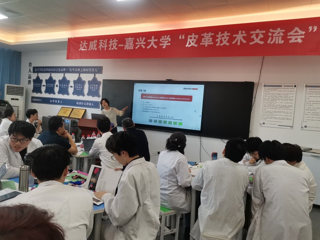 何杰经理以“时尚皮革涂饰工艺设计”为题给学生们做讲解,内容包括市场流行风格、涂饰工艺的设计方法与关键点和几种不同风格的时尚皮革涂饰工艺的设计等,融理论、技术与实物为一体。郭祥经理则就“合成革表面处理技术”进行讲解,内容包括涂料的发展史、分类和作用、表面处理剂的组成、表面处理的方法及影响因素等,融理论与市场于一体。谢衡副总一行则以题为“颜料膏与调色” “皮革涂料调色的理论与实践”的报告及配色实践(调色、测色)等进行讲解与指导,融合理论与实践为一体。夏敏经理一行以“合成革干法与表面处理技术”为主要内容进行讲解,指导学生们制作出一张张精美的生态合成革,融理论、实践、市场为一体。