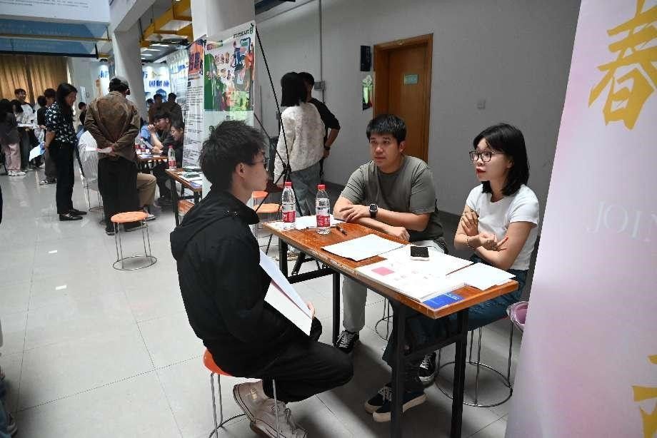 招聘会现场,招聘单位通过面对面交流、播放宣传片、展板等多种方式向参会同学介绍公司的概况、群p、职业规划、人员需求以及福利待遇,其中新凤鸣集团股份有限公司在现场开展宣讲会。
