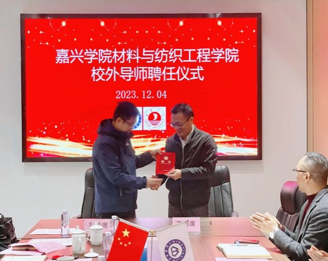 会议开始,包维维介绍了秀洲高新区的基本情况,指出高新区已跻身最高等级的“国家队”行列,目前在不断蝶变中砥砺前行。丁玉泉介绍了学校发展概况,希望以此为契机,与公司深化产教融合,扩大合作,加强交流互动。随后,寸哲介绍了材纺学院基本情况,指出学院正围绕有特色、高水平的教学研究型二级学院的目标奋勇迈进,将不断扩大和深化校企合作,更紧密推进校企地融合发展。徐井介绍了浙江名毅新能源科技有限公司的发展历程,他表示希望通过此次校企合作,进一步挖掘校企双方发展需要,有效推动校企良性互动,实现校企双方的高质量发展。仪式上,孙大宏为徐井颁发了校外导师聘书,校企双方签署捐赠协议和合作协议,名毅新能源向我校教育发展基金会捐赠10万元人民币用于支持非织造材料与工程的人才培养、专业建设。