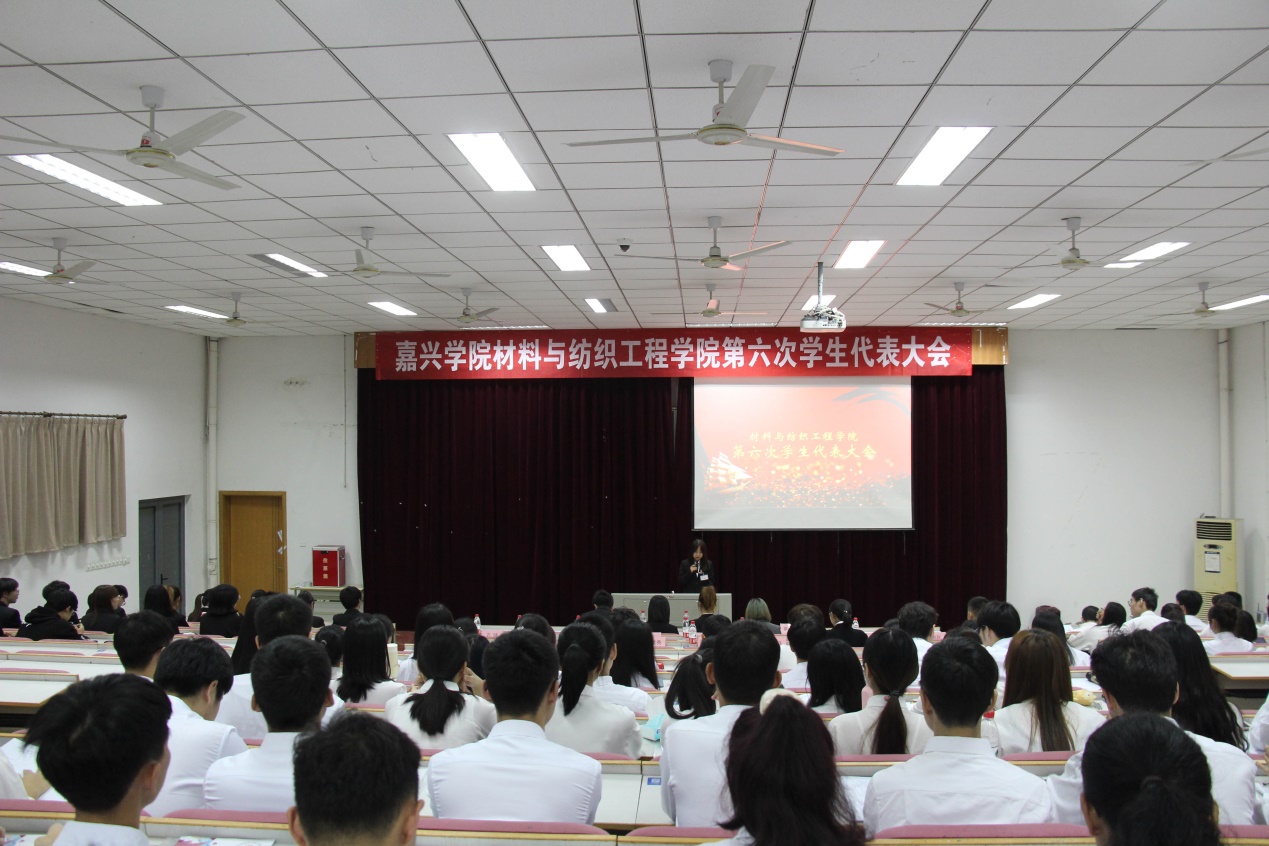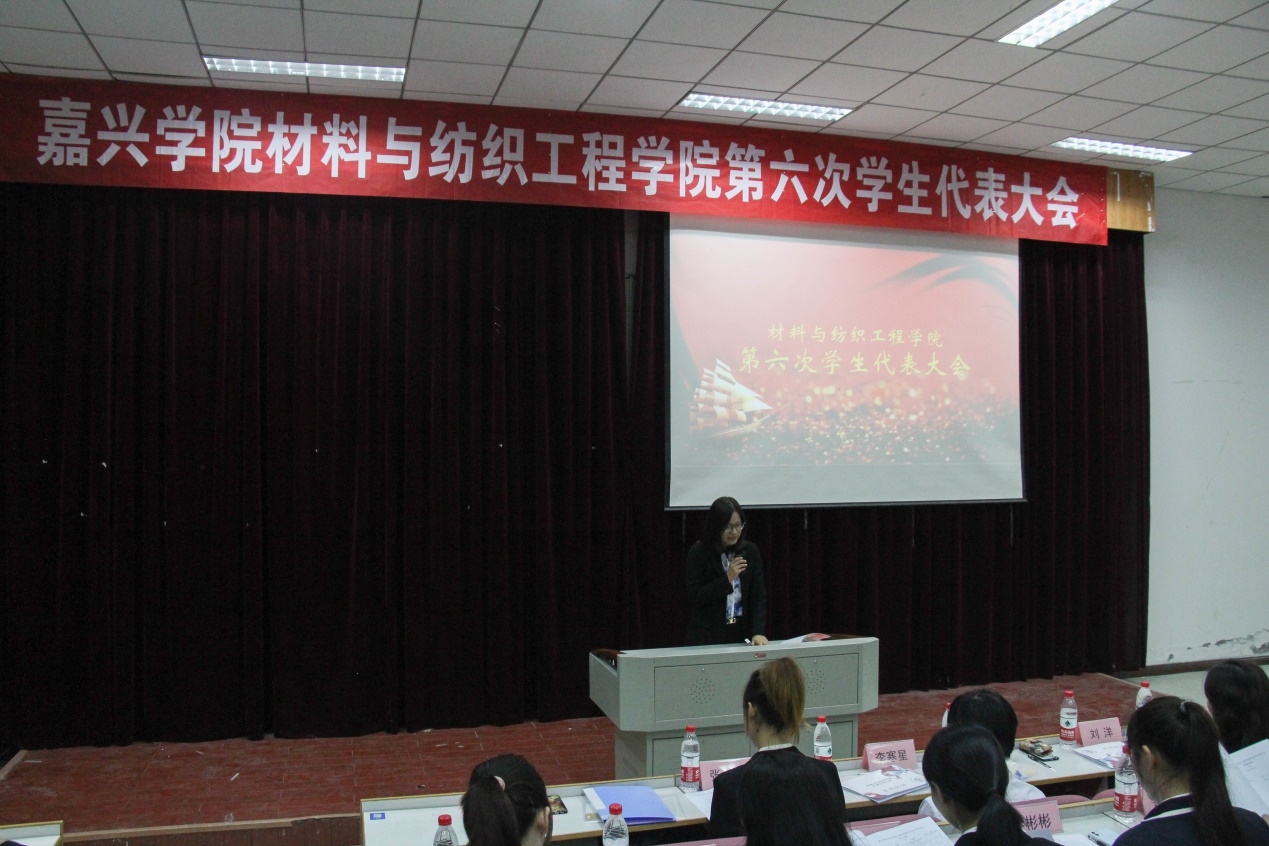 在杨冬逸同学宣读大会筹备工作报告,赵慧如同学宣读大会代表资格审查报告后,第一次全体会议大会在庄严的国歌声中开幕,并由学院党委副书记黄芳芳老师致开幕词。黄老师首先对出席会议的来宾表示热烈欢迎,对指导材纺学院学生会各项工作的老师们表达了诚挚的谢意。希望各兄弟分院学生会组织能够常来交流,多提宝贵意见,帮助我院学生会进一步提高工作水平。接着,嘉兴学院学生会副主席方益鹏同学代表校学生会肯定了材纺学院学生会一年来的工作成果,并提出了宝贵建议。随后,群p