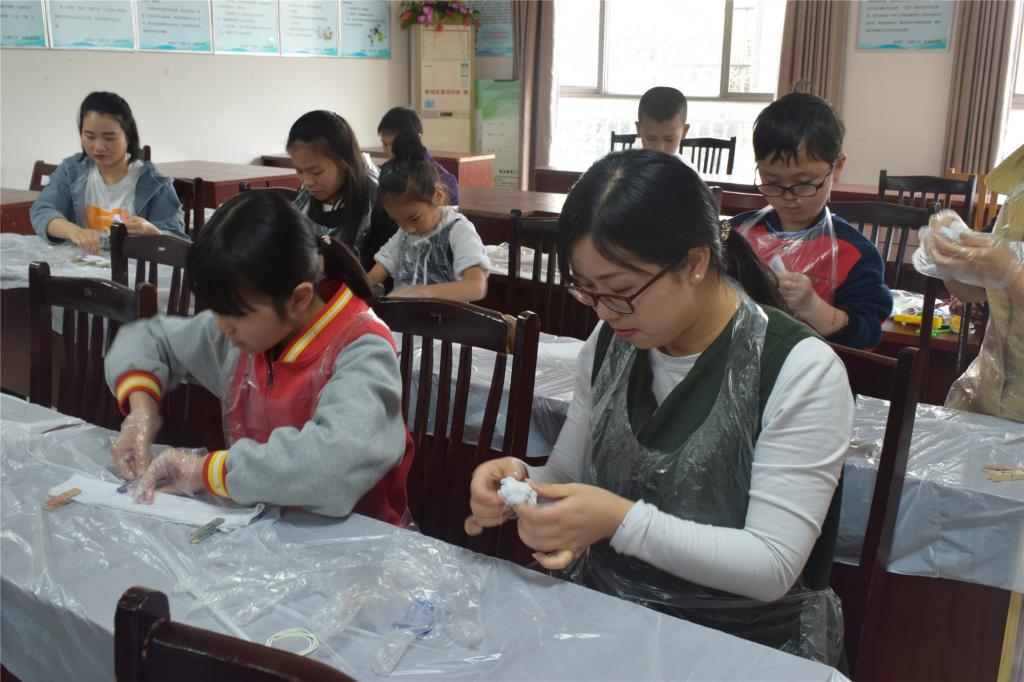 4月27日下午14:30,材纺学院“青春人‘材’”志愿服务队7名志愿者在嘉兴市新家园社区面向10对亲子家庭开办手工扎染小课堂。