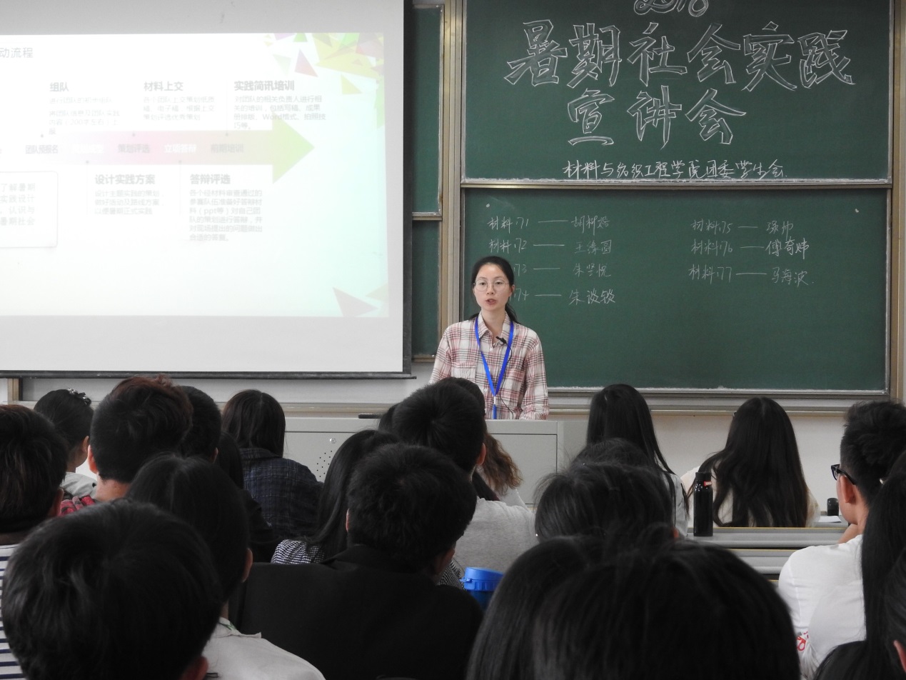 团委召集材料类17级各班班委在十号楼402教室举行了“以实践之名 伴‘材’子之行”为主题的2018年暑期社会实践策划设计大赛宣讲会。学院团委副书记刘洋老师、2017年暑期社会实践校级“十佳团队”代表刘娜同学及“优秀团队”代表桑婧婧同学出席了本次宣讲会,向学弟学妹们传授经验。
