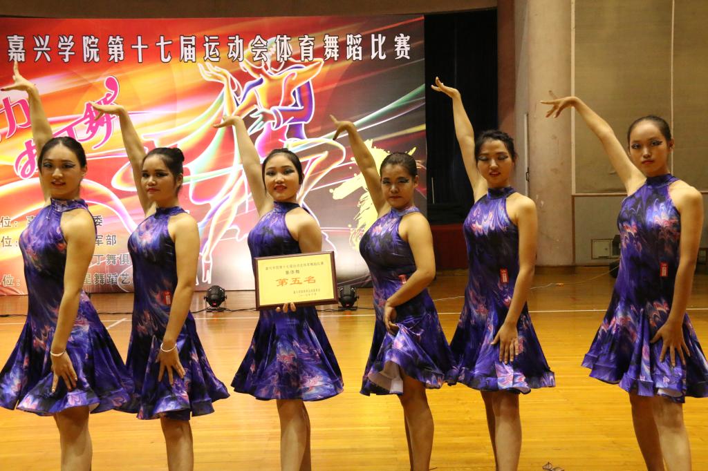 此次比赛主要形式为拉丁舞6人银牌组(恰恰、伦巴两两支舞连跳),参赛学院为嘉兴学院各二级学院代表队。根据前期抽签结果,我院于第六队出场。看着其他二级学院代表队精彩纷呈的表演,我院参赛者及观众依然对自己及自己队员充满信心。待我院代表队上场时,观众的呼声十分高昂热情,场上的选手也表现优秀。最终,经过激烈的竞赛,我院取得了第五的优异成绩。在激烈的掌声和代表荣誉的获奖证书背后印证的是队员们日夜的坚持,是她们对拉丁舞衷心的热爱,是努力得到认可的欣慰。本着“友谊第一,比赛第二”的宗旨,各未获奖的二级学院也都上前祝贺,互相吸收交流经验,促进共同进步。、
