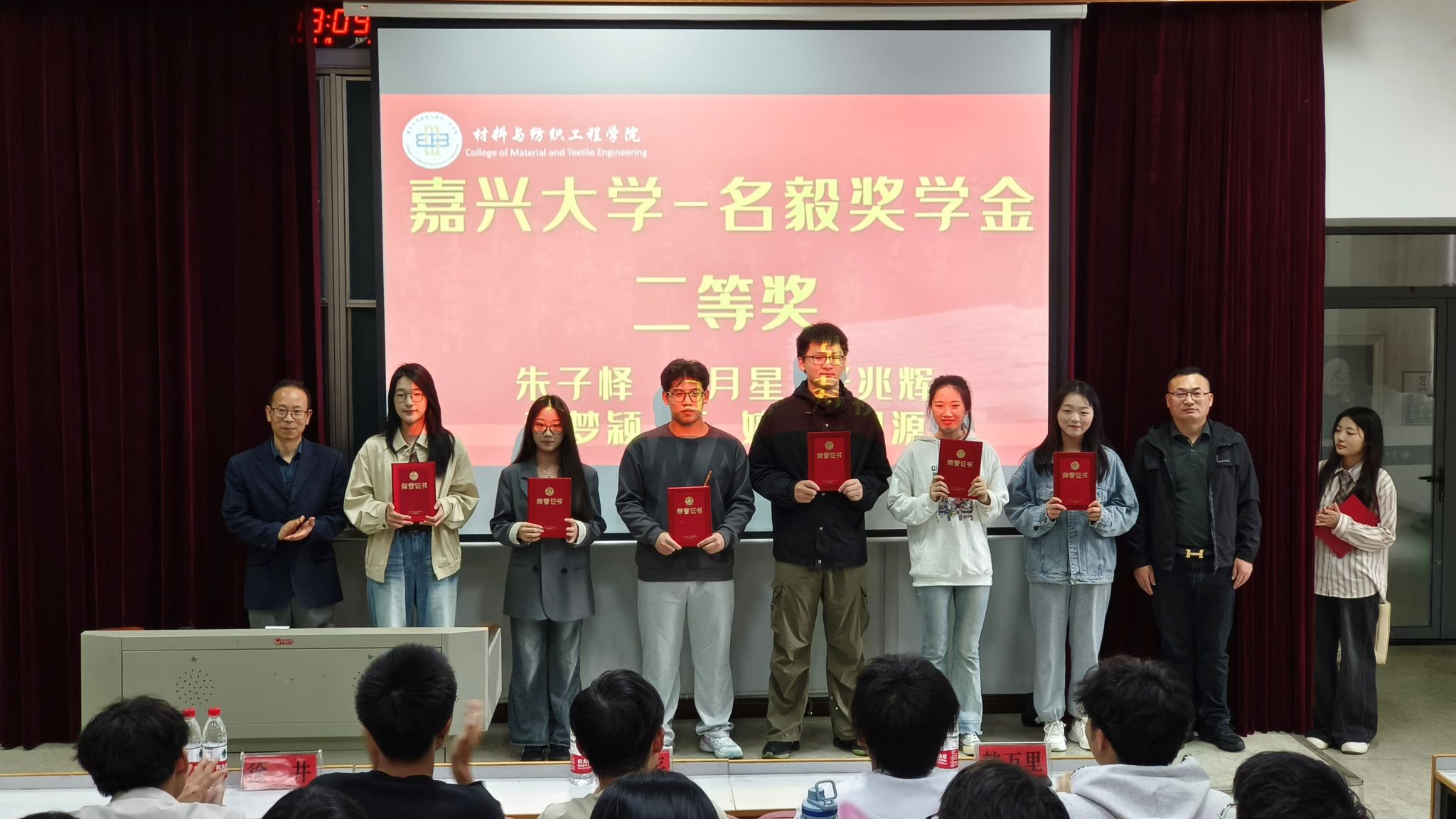 在博闻楼学术报告厅,“坚定梦想,毅力前行”非织造材料与工程专业名毅奖学金颁奖活动也在如火如荼地进行着。此次颁奖活动旨在表彰在学术、实践等方面表现突出的优秀学生,并激励更多学生树立远大目标、发扬坚毅品质。活动上,企业代表徐井分享了设立“名毅奖学金”的初衷和愿景,表达了对青年人才的期待与支持。学院领导代正伟致辞,对获奖学生表示祝贺,并鼓励他们继续努力,再创佳绩。颁奖环节上,企业代表和学院领导共同为获奖学生颁发了荣誉证书和奖学金。随后,获奖学生代表廖海燕发表感言,分享了她的学习成长经历和未来规划,暑期出国交流学生代表王婷和张梦菲上台分享了他们的海外学习心得和体会。