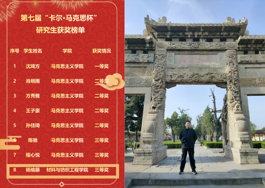 1月11日,第七届“卡尔·马克思杯”浙江省大学生理论知识竞赛决赛在浙江工商大学圆满落幕。我院24级研究生在本次竞赛中表现出色,实现了历史性的突破,杨榆藤同学凭借扎实的思政理论知识功底和出色的现场表现,荣获个人三等奖,为我院赢得了宝贵的荣誉,同时作为团队成员,获研究生组团体三等奖。