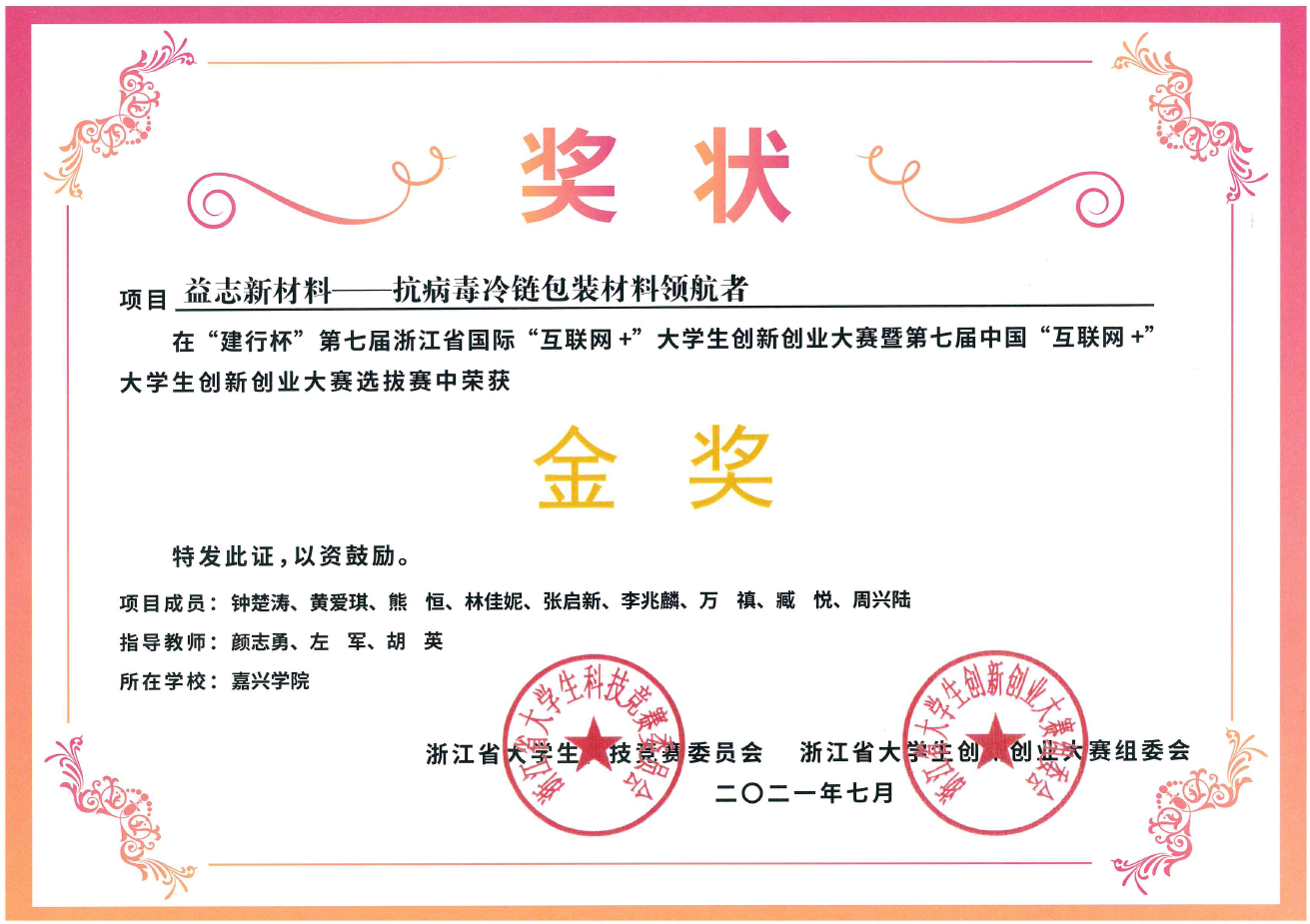 高材教工支部颜志勇教授指导的学生项目获“互联网+”全国大学生创新创业大赛铜奖1项,指导的项目:“益志新材料—抗病毒冷链包装材料领航者”获“建行杯”浙江省国际“互联网+”大学生创新创业大赛暨第七届中国“互联网+”大学生创新创业大赛选拔赛中获省级金奖1项。项目“抗菌抗病毒非织造布应用研发”获挑战杯省级三等奖1项。