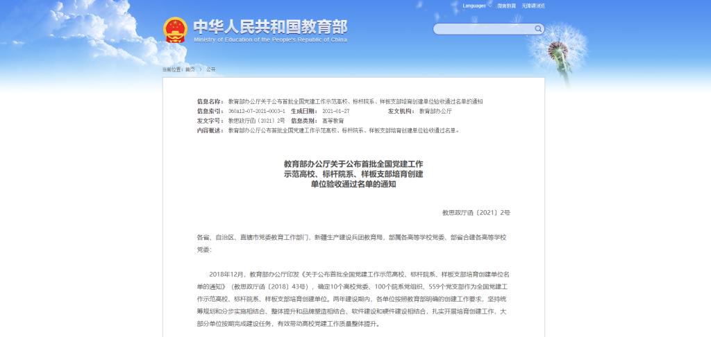 126日,教育部办公厅发布了关于公布首批全国党建工作示范高校、标杆院系、样板支部培育创建单位验收通过名单的通知(教思政厅函〔20212),其中,我校群p 高材教工党支部通过首批 “全国党建工作样板支部”培育创建单位验收。