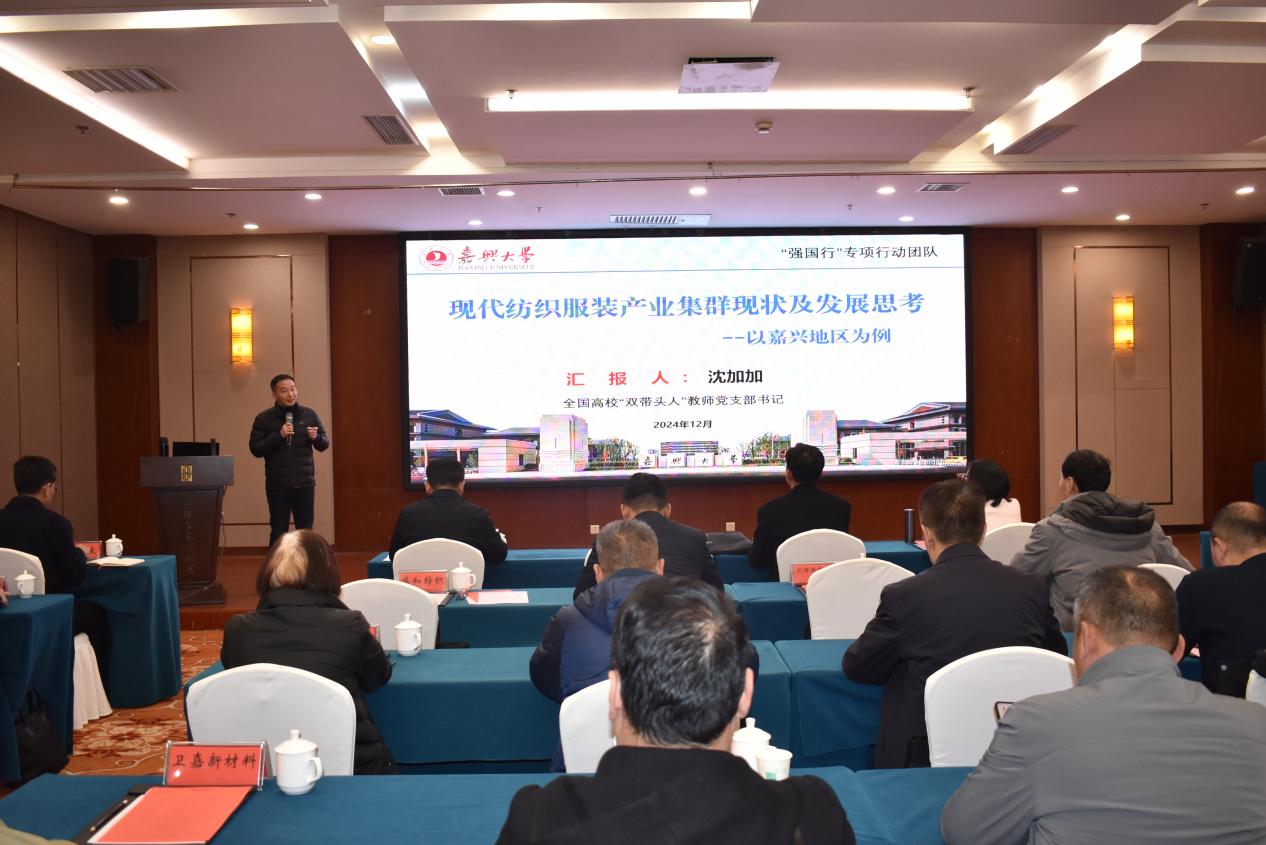 会上,沈加加书记围绕纺织服装产业集群现状及发展趋势进行了专题报告,并围绕嘉兴地区纺织服装产业的发展,对纺织服装产业面临的困境和机遇进行了详细的分析和讲解。本次专题报告极大提升了学院专业在地方产业的影响力,并为将来推动创新链、产业链、教育链、人才链融合发展提供了契机。